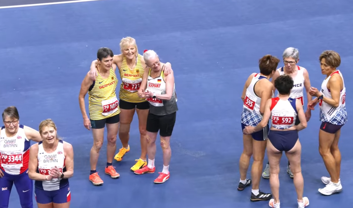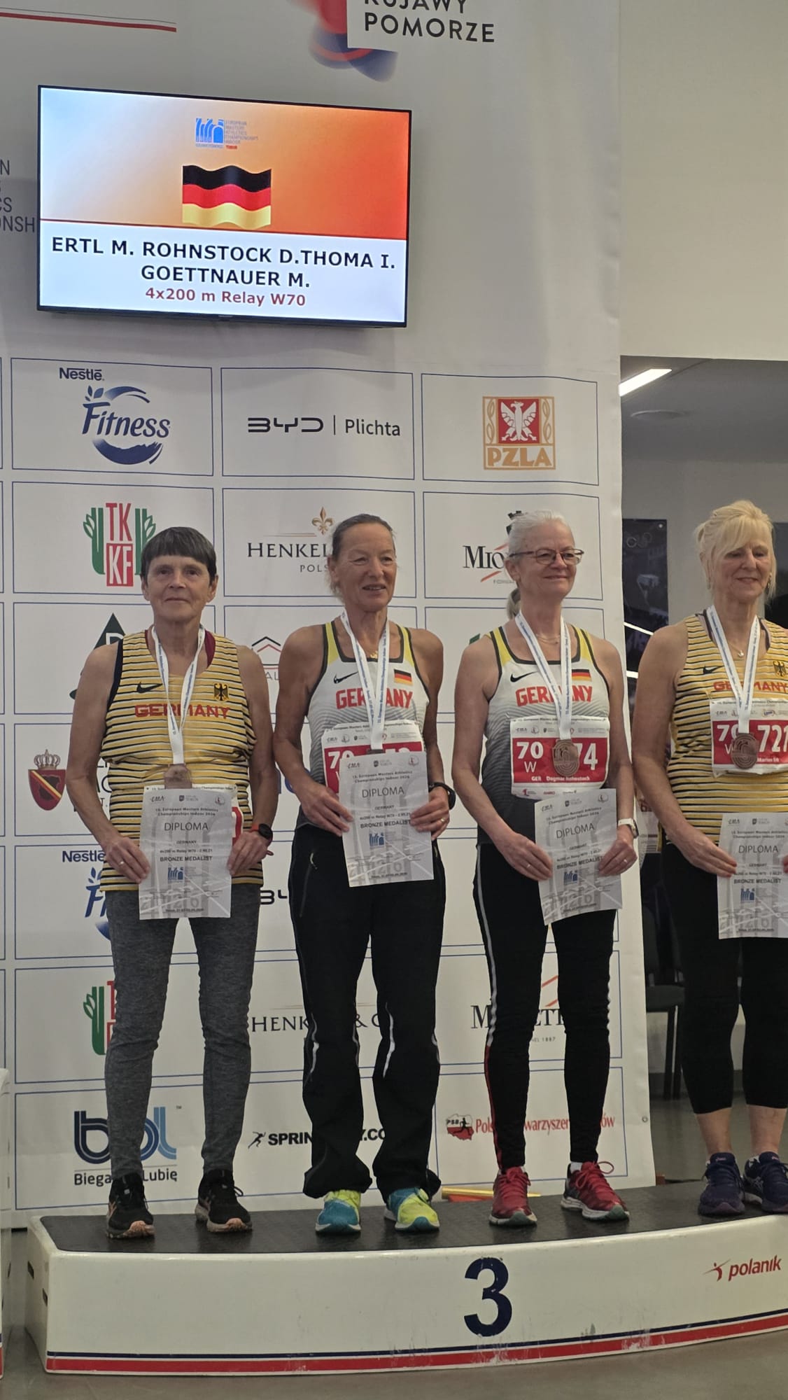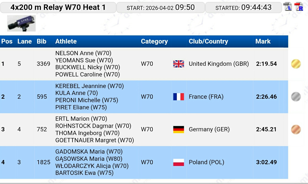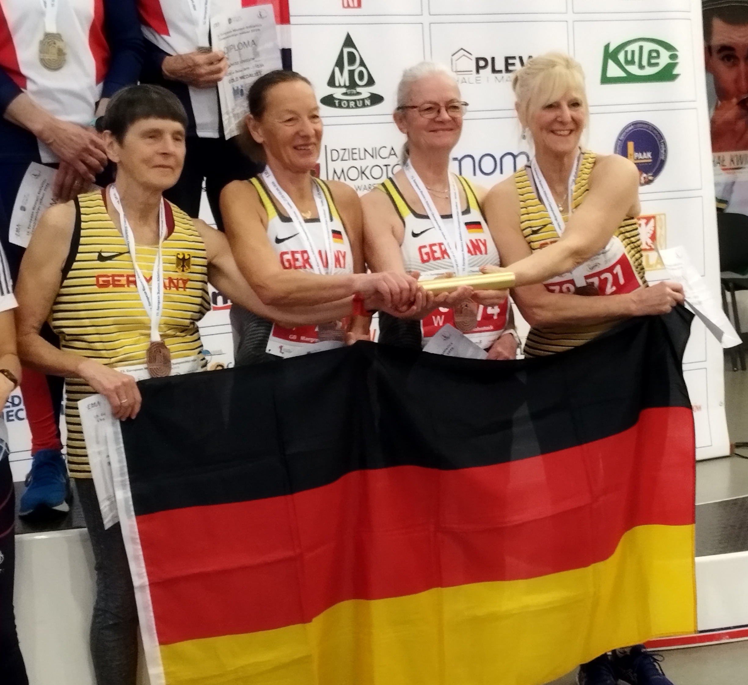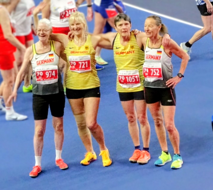 Die W70-Läuferinnen wussten, dass mit dem Abo-Sieger UK und den starken Französinnen bestenfalls ein dritter Platz möglich wäre, wenn das vierte Team aus Polen auf Abstand gehalten werden konnte. Dank sauberer Wechsel und ohne Bahnübertritte gelang das Vorhaben: Bronze für Ingeborgs Team.