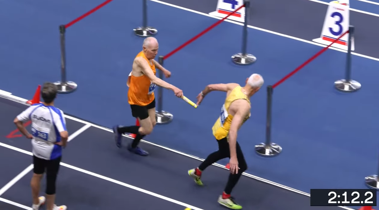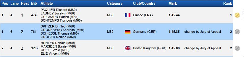 Im 2. Lauf der M60-Staffelwettbewerbe ging es auf der Zielgeraden um Hundertstel-Sekunden. Mit absoluter Willensleistung sicherte der Schlussläufer mit 1/100 Sekunden Vorsprung den Laufsieg und in der Zusammenfassung beider Läufe den Silberrang. Durch nachträglichen Juryentscheid wurde auch die drittplatzierte Staffel aus Großbritannien mit Silber geehrt.